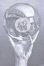 framed image: after (and with apologies to) M.C. Escher, Hand with Reflecting Globe, 1935.